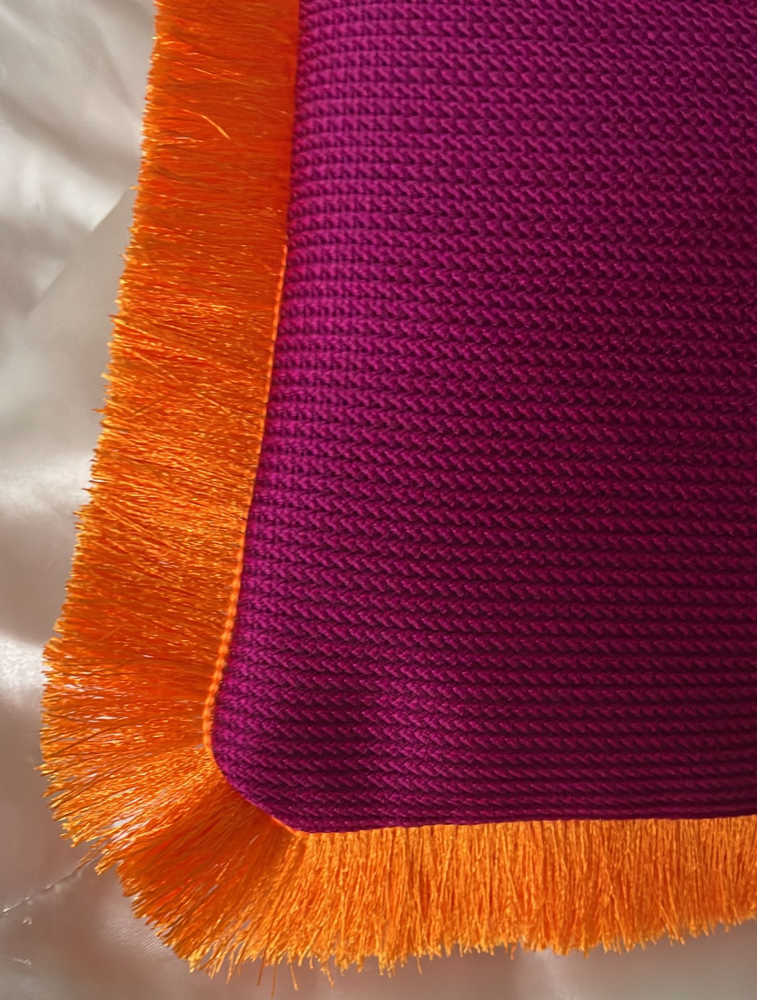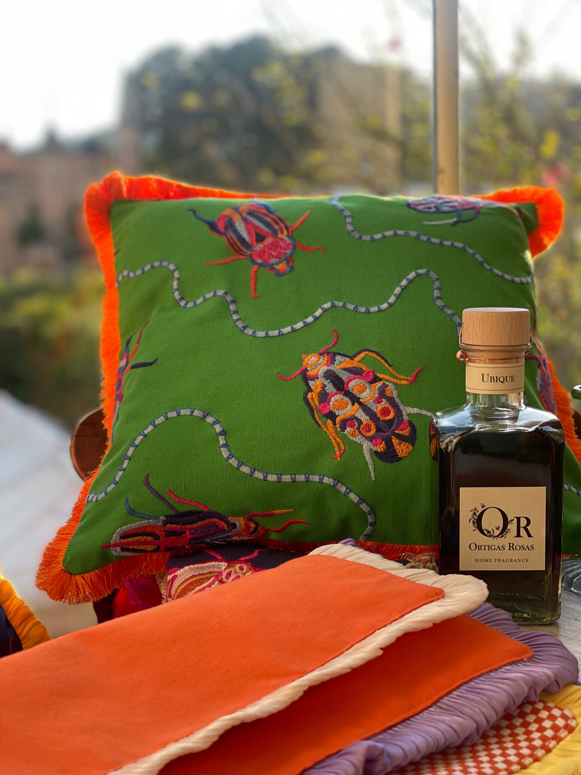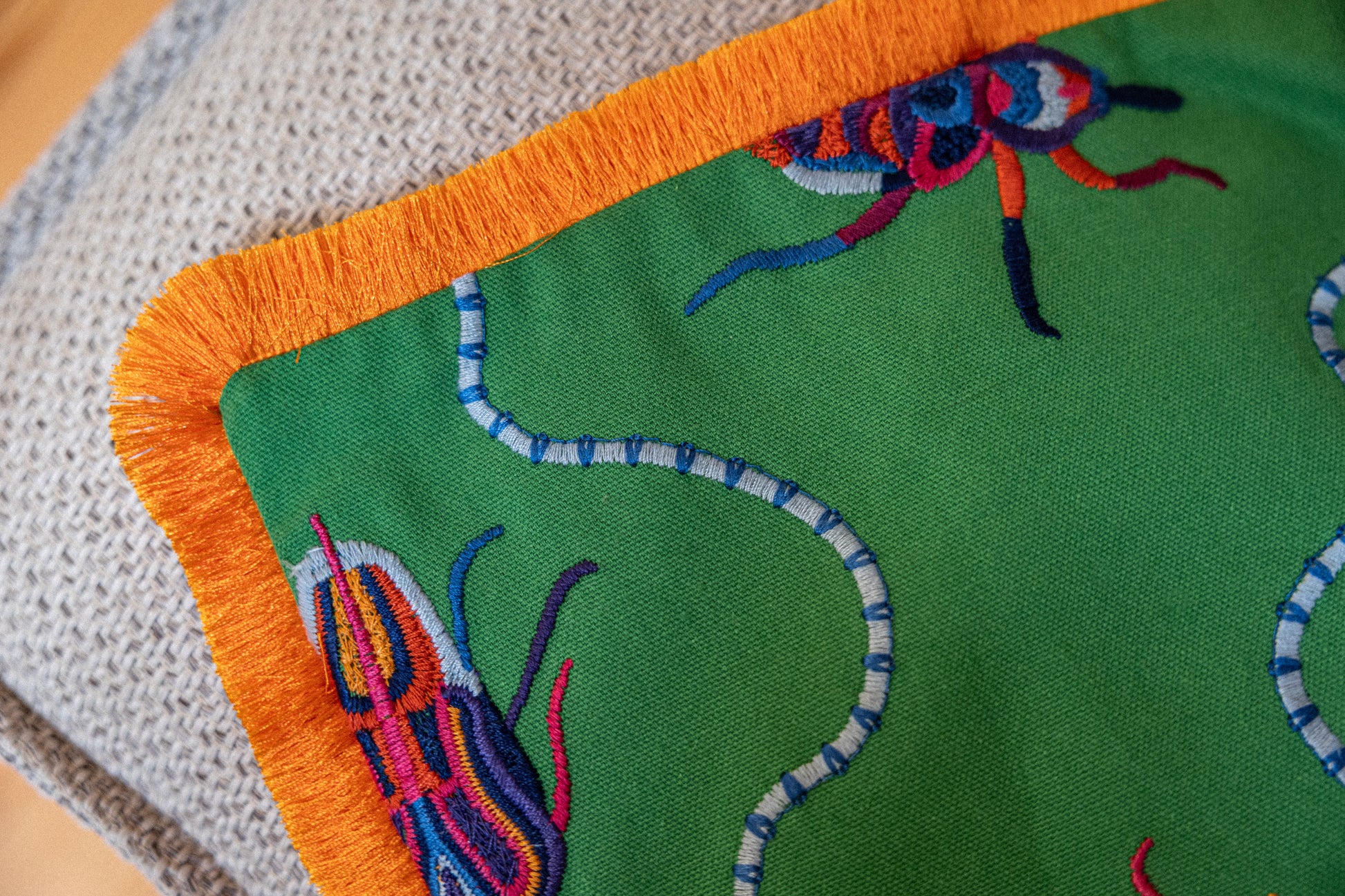 Este cojín reversible está diseñado para dar un toque de color a la ropa de cama y los espacios de descanso. Esta creación es única y luce un tejido de algodón verde por un lado, con un bordado del patrón "Jewel Beetles", mientras que el reverso está confeccionado con una elegante tela fucsia. Todo el contorno del cojín está decorado con un estiloso fleco de color naranja brillante.