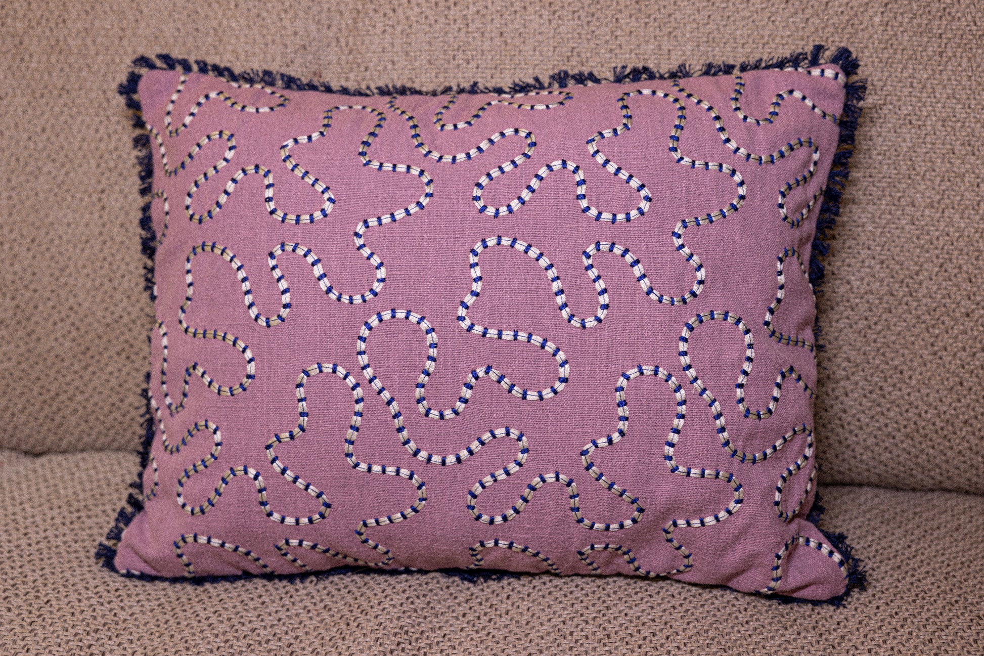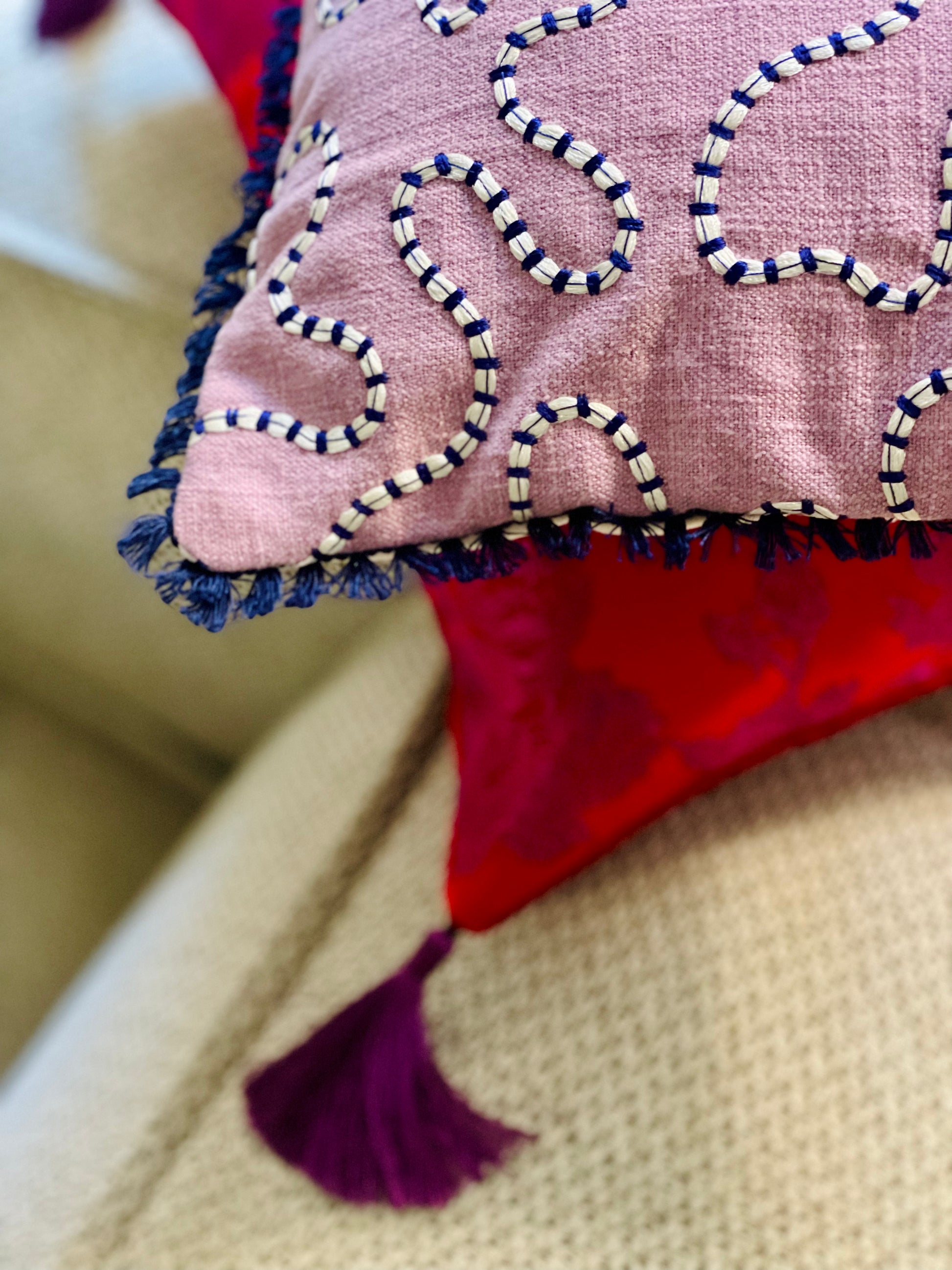 This unique cushion features a pastel lilac cotton fabric on one side, with an embroidered "Wiggle" pattern, and a white fabric on the other side. Around the cushion is an elegant dark blue fringe.
