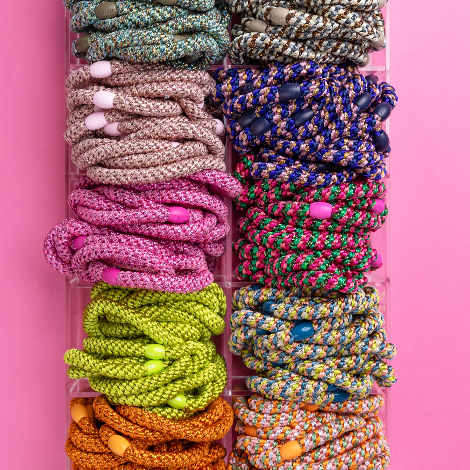 Super cute as a bracelet and recognized as one of the best hair elastics in the world. The unique weaving technique makes them extremely soft for every hair type. KKNEKKI does not fade, fray or slack even when worn in salt water.
