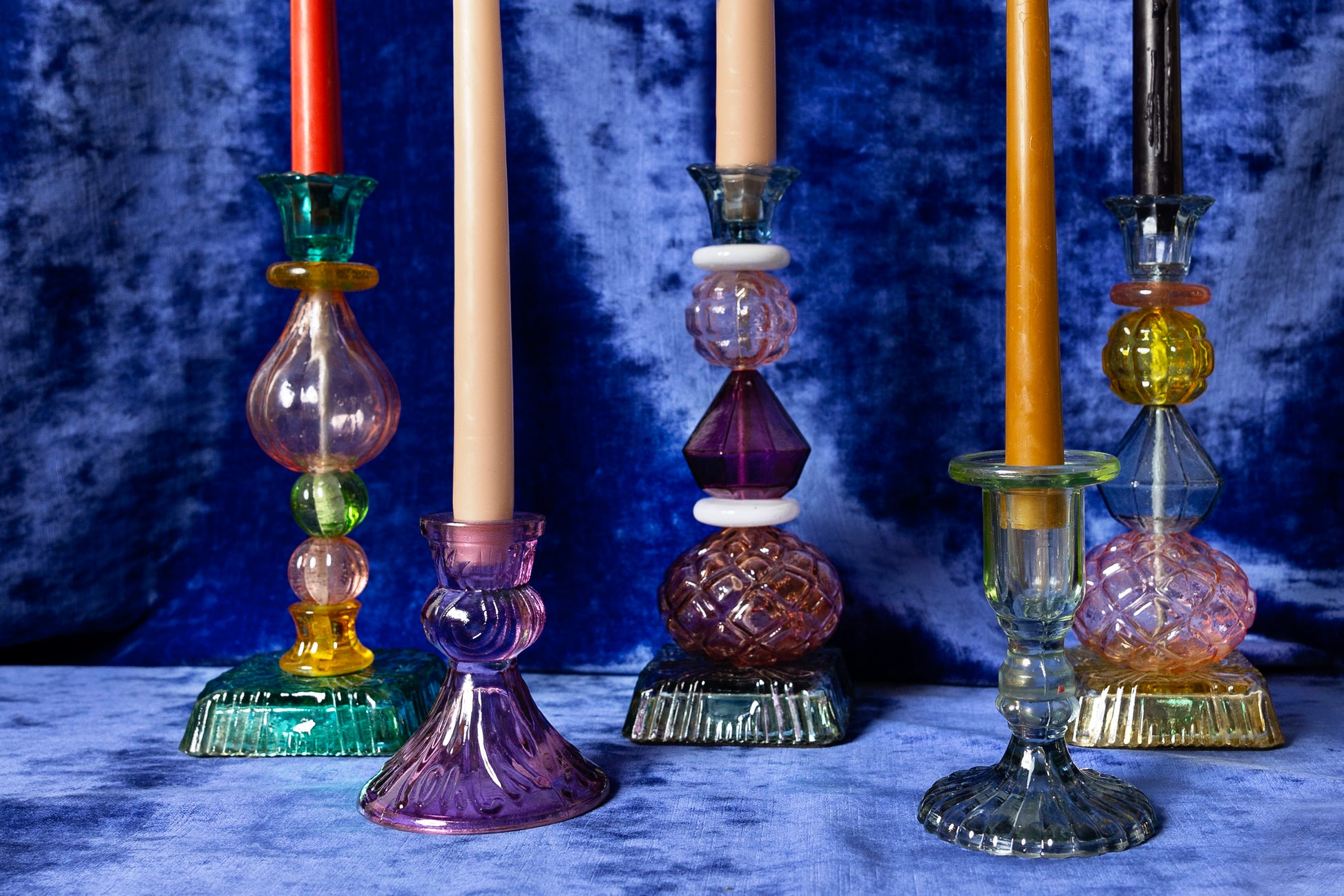 Lovely candlestick in a pretty range of colours which will enhance any table setting, made of 100% recycled glass. Use in singles, pairs, or grouped together for a perfect tablescape.